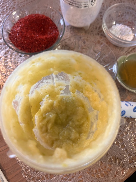 冷ました白玉粉のりに韓国唐辛子、一味唐辛子、すりごま、粉末昆布(私は粉末あごだしを使用)、甘酒を加え、よく混ぜます。
