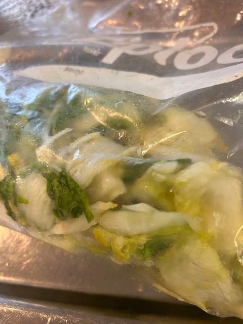 半分を1kgの白菜と和えます。残りの半分はジップロック等に入れて冷凍保存へ。